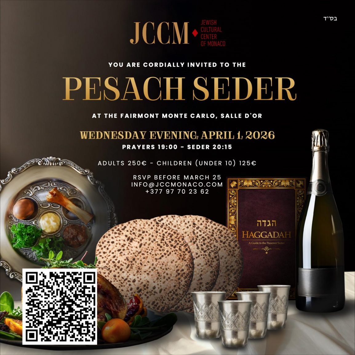 THE PESACH SEDER At the Fairmont Monte Carlo Salle d’Or Wednesday Evening, April 1, 2026 Prayers: 19h00 – Seder: 20h15 250€ per Adult – 125€ per Child (under 10) RSVP before March 25